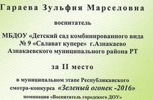 Поздравляем воспитателя МБДОУ №9 " Салават купере" Гараеву Зульфию Марселовну занявшую 2 место в муниципальном этапе Республиканского смотра - конкурса "Зеленый огонек-2016" в номинации "Воспитатель городского ДОУ " 29.03.2016