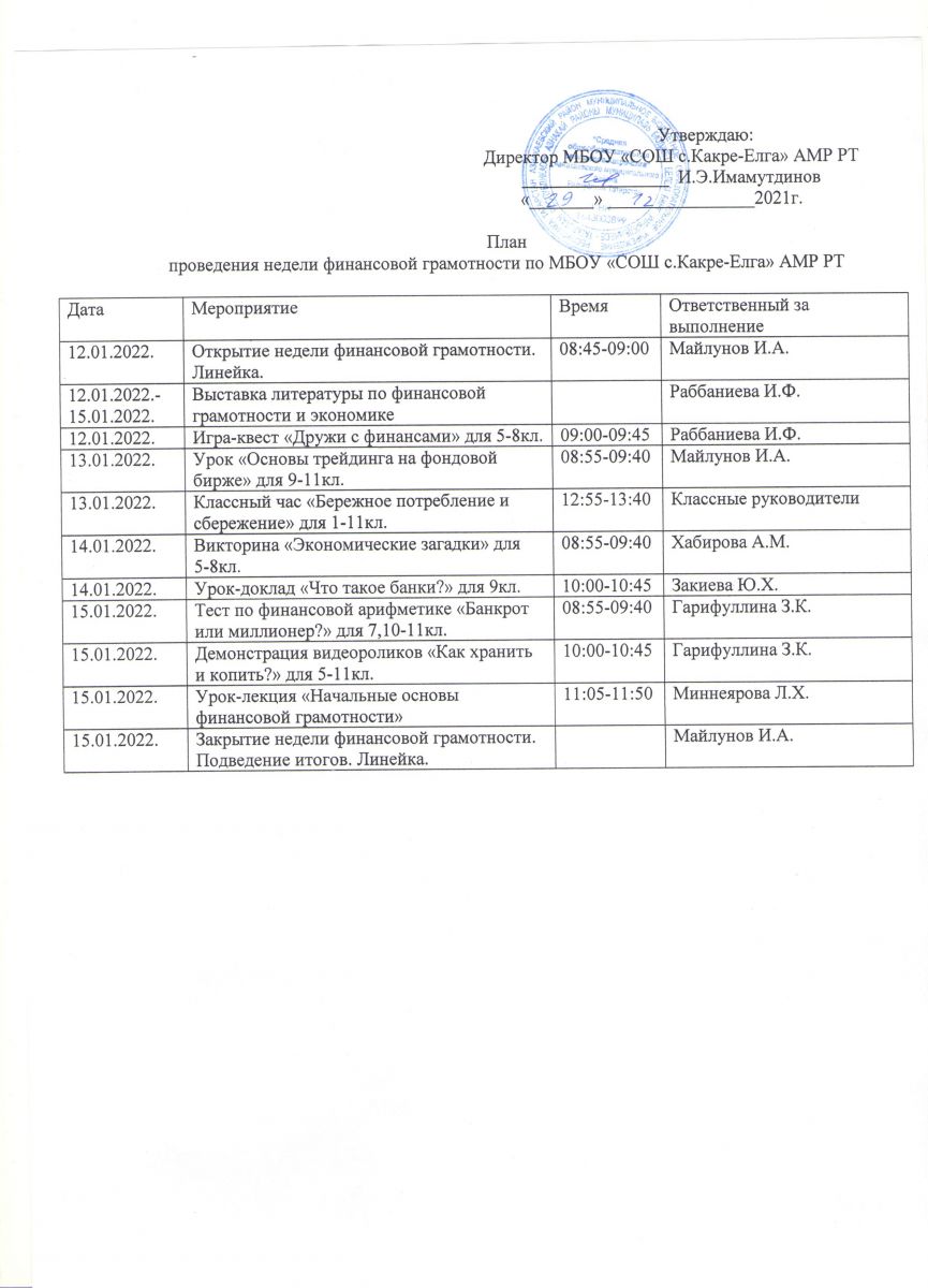 План проведения недели финансовой грамотности по МБОУ "СОШ с.Какре-Елга" АМР РТ