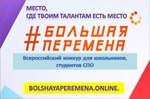 В рамках президентской платформы «Россия – страна возможностей» стартовал новый сезон Всероссийского конкурса «Большая перемена». Это сообщество для тех, кто готов меняться и менять мир. Здесь рулят не оценки, а способность нестандартно мыслить. ... Регистрация участников открыта на платформе bolshayaperemena.online. Главная цель конкурса – дать возможность каждому участнику найти свои сильные стороны и раскрыть свои таланты.