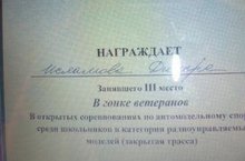 В гонке ветеранов на Открытых соревнования по автомобильному спорту среди школьников в категории радиоуправляемые модели учащийся объединения «Автомоделирование» Исламов Динар занял III место 30.11.2015