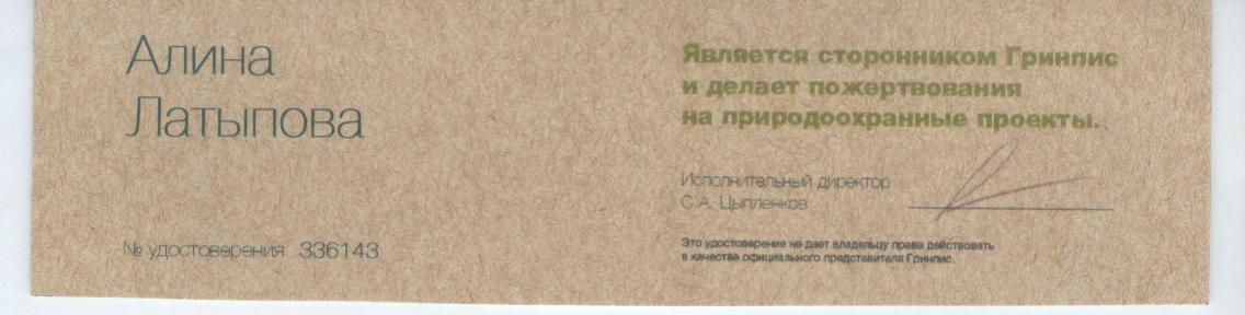 Удостоверение сторонника Гринпис (Латыпова А.С.)