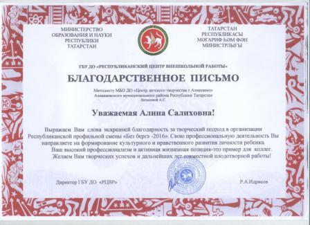 Благодарственное письмо за творческий подход в организации профльной смены "Без бергә - 2016" (Латыпова А.С.)