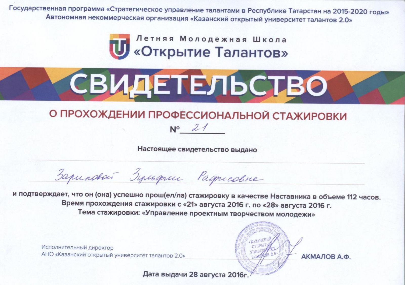 Свидетельство о прохождении профессиональной стажировки (Зарипова З.Р.)
