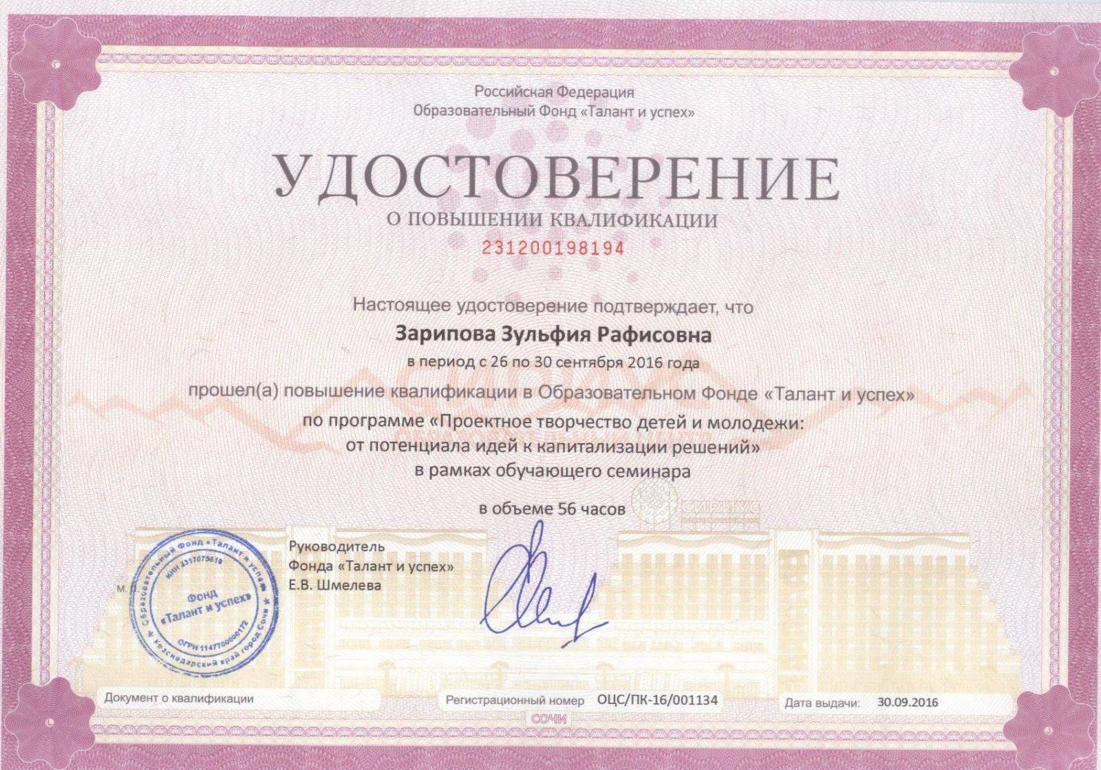 Удостоверение о повышении квалификации (Зарипова З.Р.)