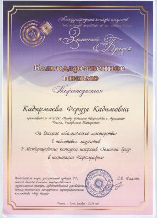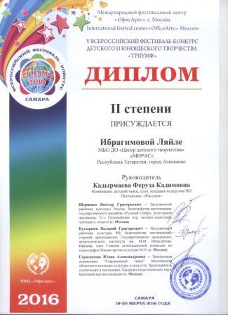 Благодарственное письмо от оргкомитета Всероссийского фестиваля-конкурса "Триумф" за поддержку детского и юношеского творчества (Кадырмаева Ф.К.)