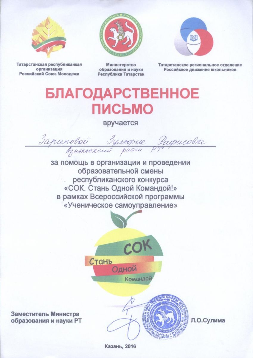 Благодарственное письмо за помощь в организации и проведении образовательной смены Республиканского конкурса (Зарипова З.Р.)