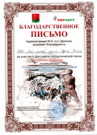 Благодарственнон письмо за участие в фестивале патриотической песни "Красная ромашка" (Стрих Р.Р.)