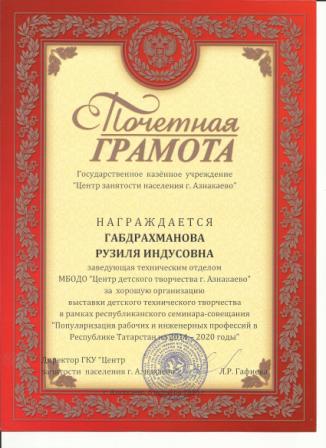 Почетная грамота за хорошую организацию выставки детского технического творчества (Гарипова Л.Р.)