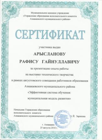 Сертификат участника за презентацию опыта работы на выставке технического творчества (Арсланов Р.Г.)
