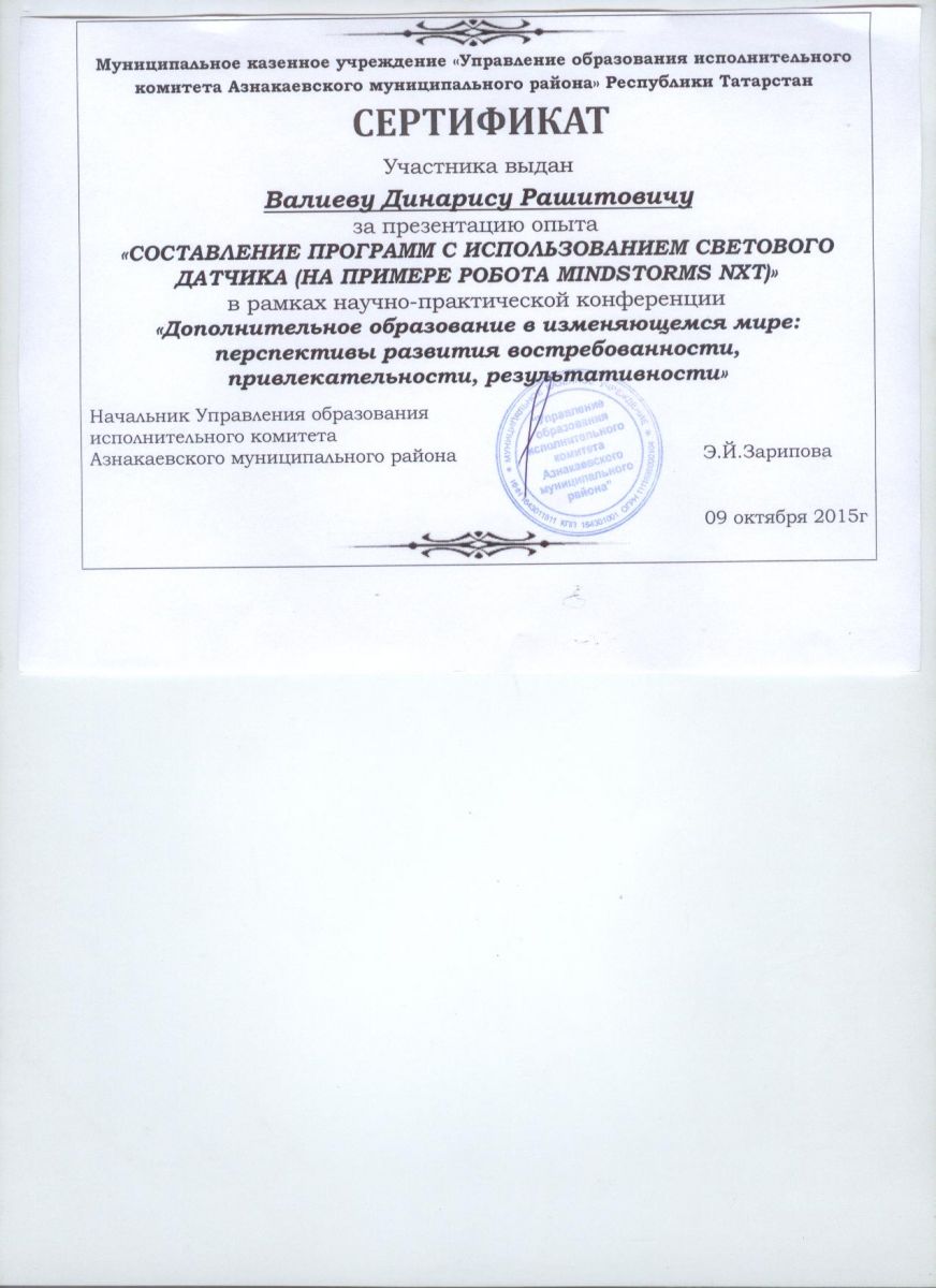 Диплом участника практического семинара, посвященного робототехническому набору (Латыпова А.С.)