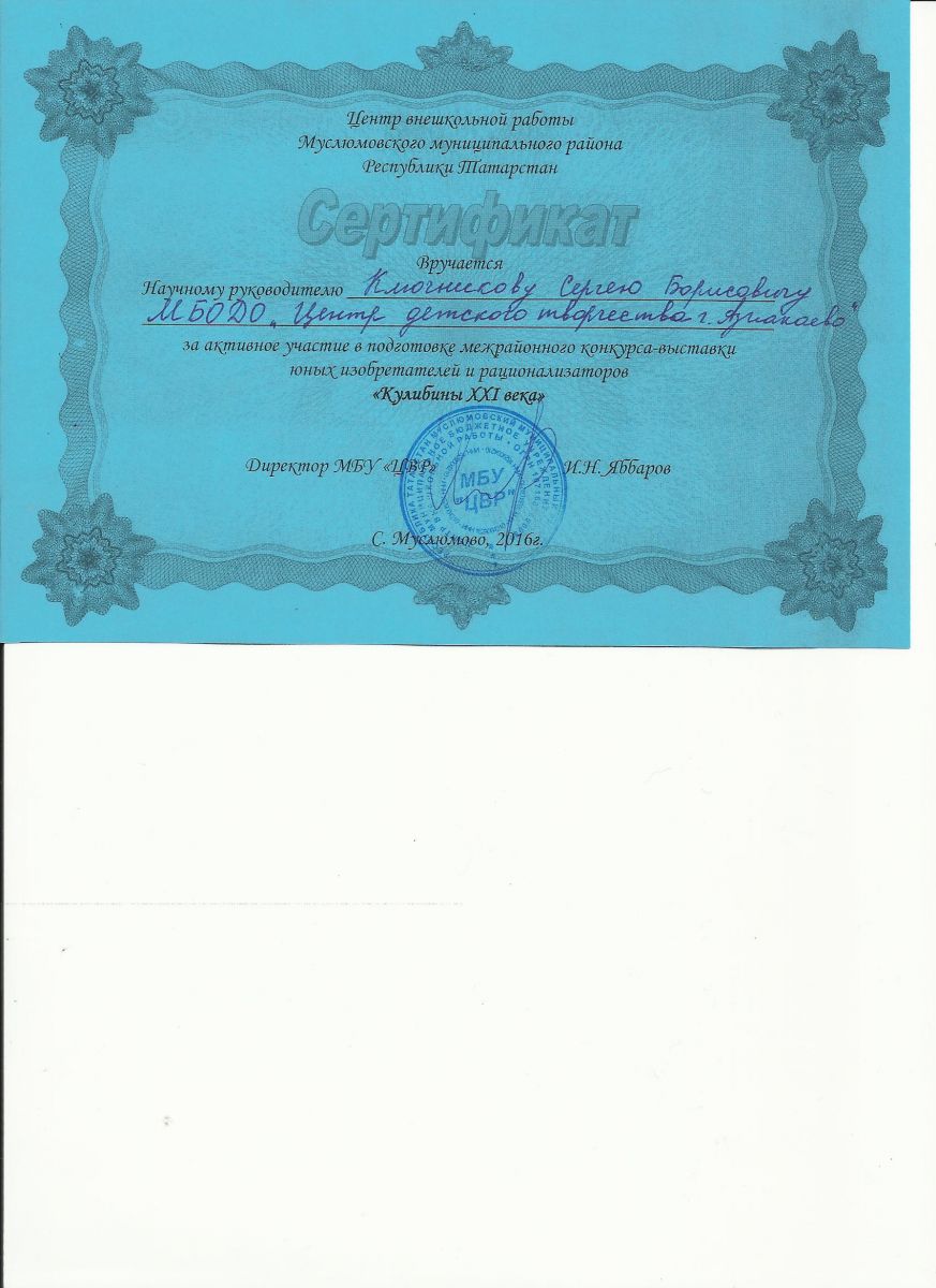 Cертификат научному руководителю за активное участие в конкурсе-выставке (Ключников С.Б.)