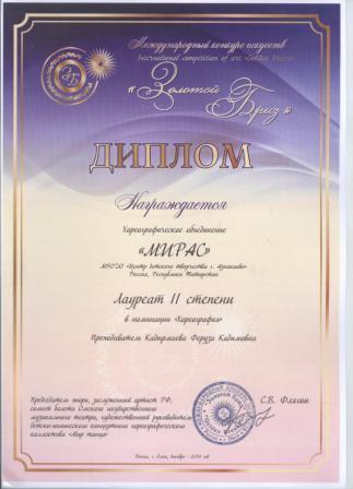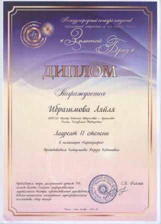 Лауреат 2 степени в международном конкурсе искусств "Золотой Бриз" (Ибрагимова Л., Кадырмаева Ф.К.)