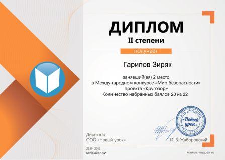 2 место в международном конкурсе «Мир безопасности проекта «Кругозор» (Гарипов З., Латыпова А.С.)