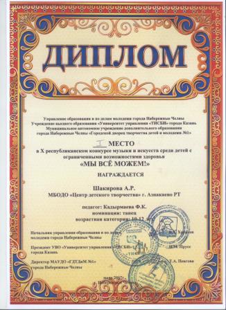 Лауреат республиканского конкурса "Парус надежды" (ансамбль "Соловушка", Хазиева А.З.)