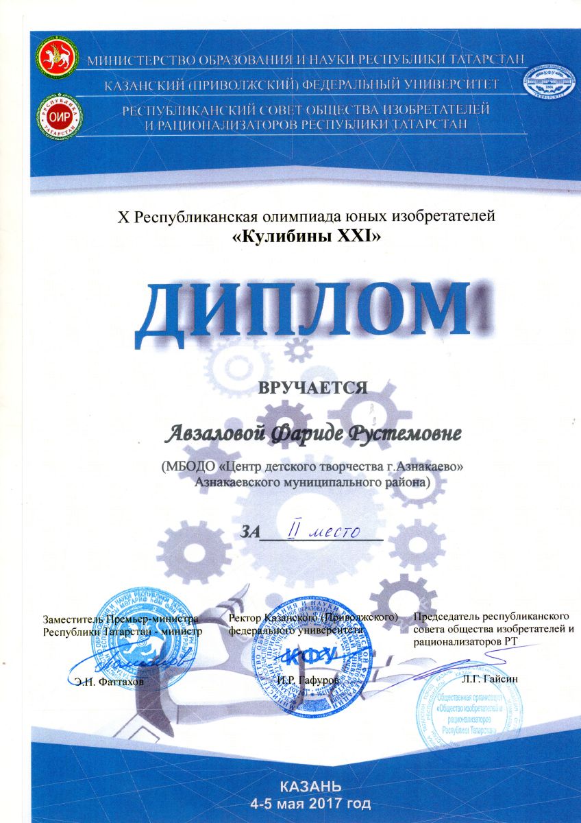 2 место в Республиканской олимпиаде юных изобретателей "Кулибины 21 века" (Авзалова Ф.)