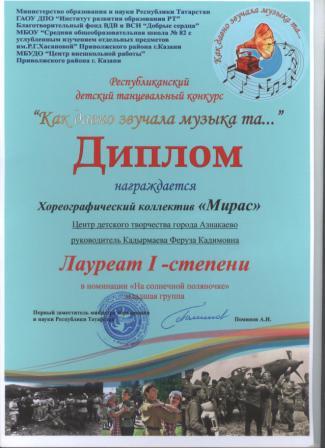 1 место в международном конкурсе "Свет звезды" ("Мирас", Кадырмаева Ф.К.)
