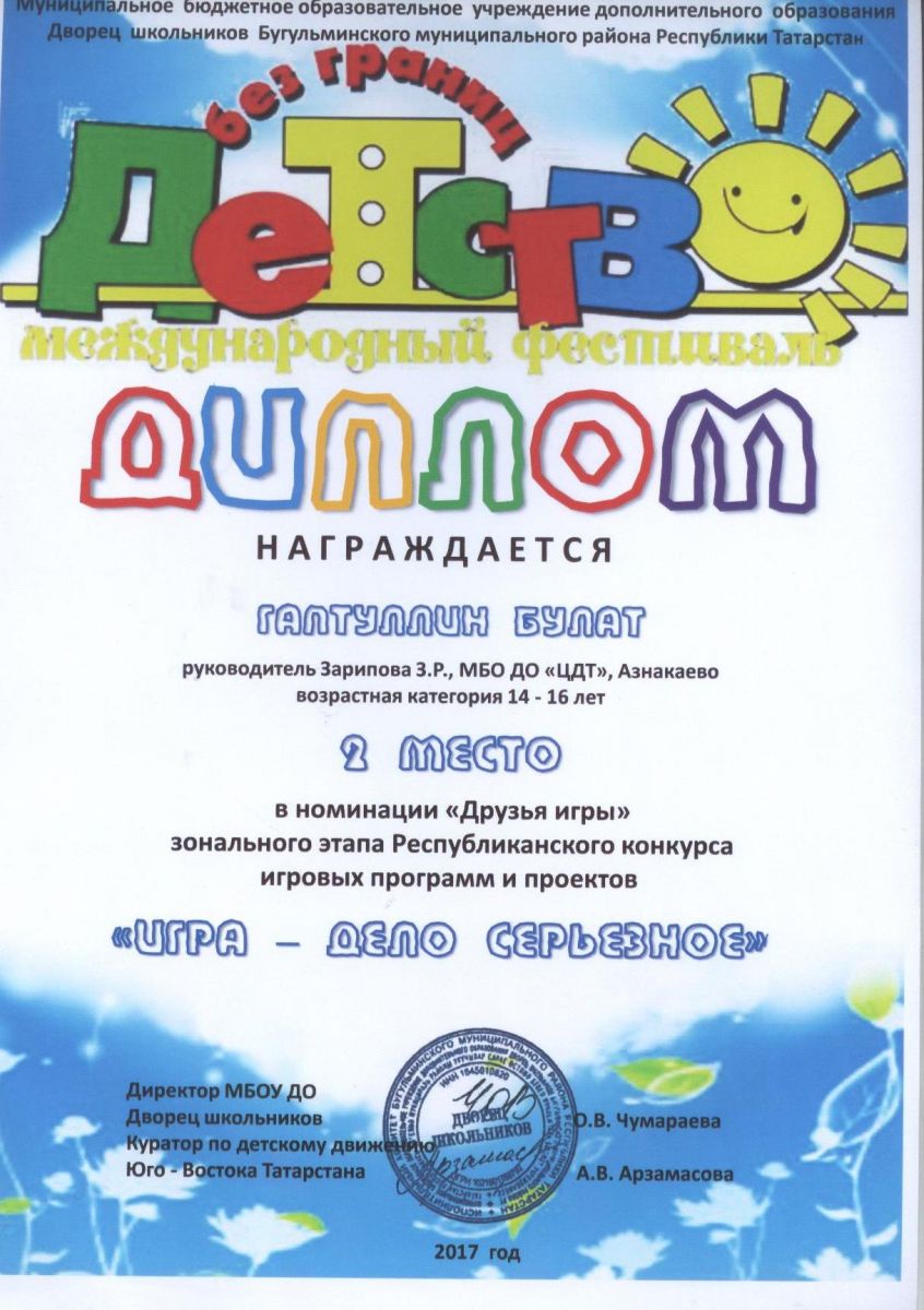 Диплом международного фестиваля "Игра - дело серьезное" (Габдуллин Б., Зарипова З.Р.)