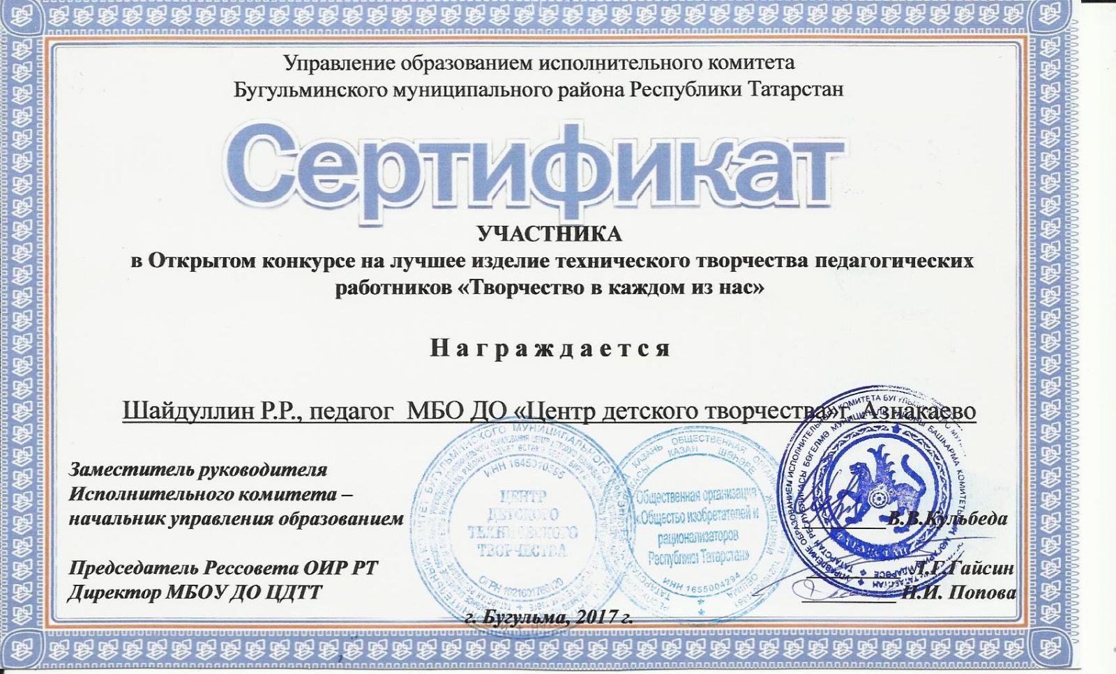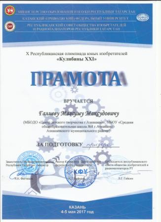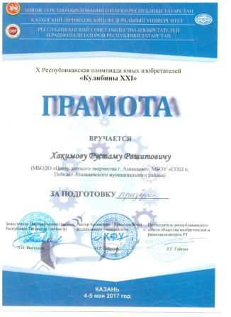 Благодарность за подготовку призеров к Республиканской олимпиаде "Кулибины 21 века" Сагитова А.Н.)