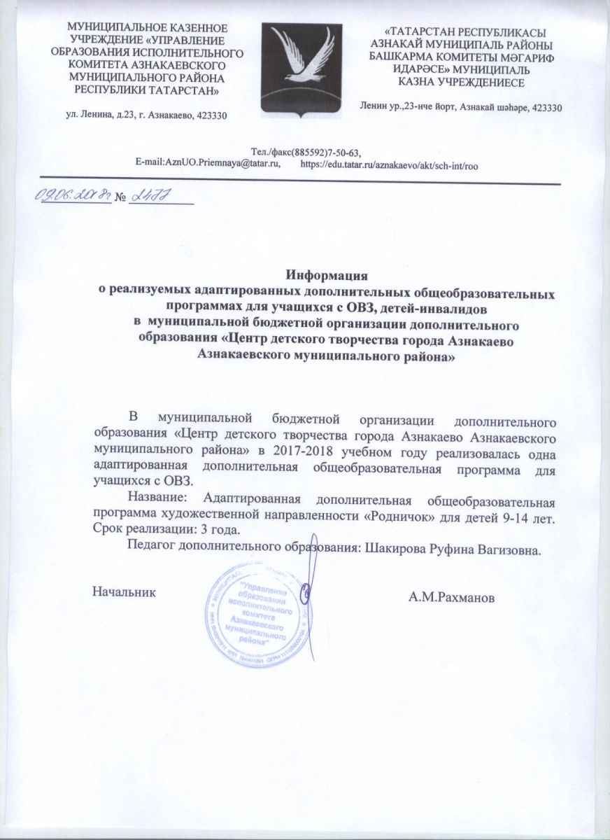 Информация о реализуемых адаптированных дополнительных общеобразовательных программах для учащихся с ОВЗ, детей инвалидов в МБОДО "ЦДТ г. Азнакаево" (2017-2018 учебный год)