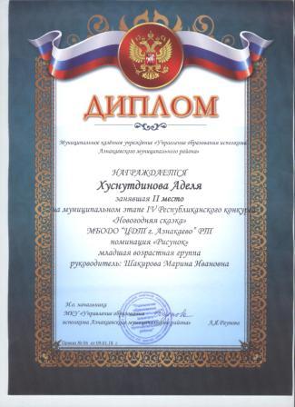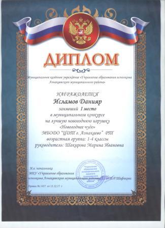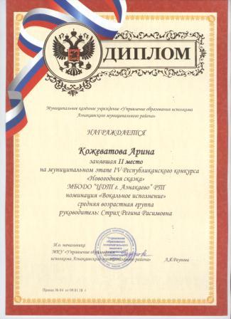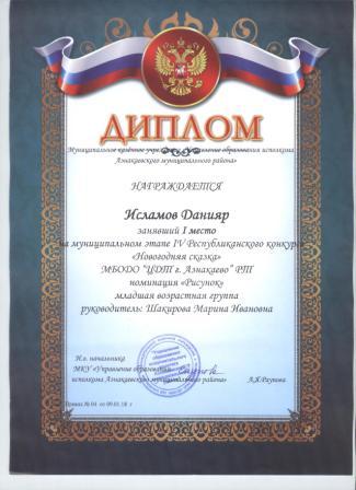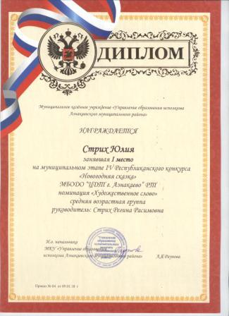 1 место на муниципальном этапе Республиканского конкурса "Новогодняя сказка" (Стрих Ю. Стрих Р.Р.)