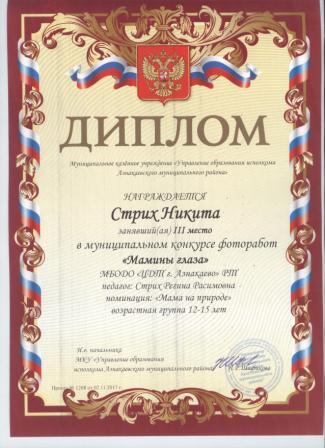 3 место в муниципальном конкурсе фоторабот «Мамины глаза» (Стрих Н., Стрих Р.Р.)