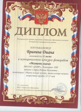 2 место в муниципальном конкурсе фоторабот «Мамины глаза» (Брагина Д., Стрих Р.Р.)
