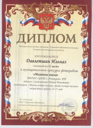 2 место в муниципальном конкурсе фоторабот «Мамины глаза» (Давлетшин И., Сулейманова Р.Р.)