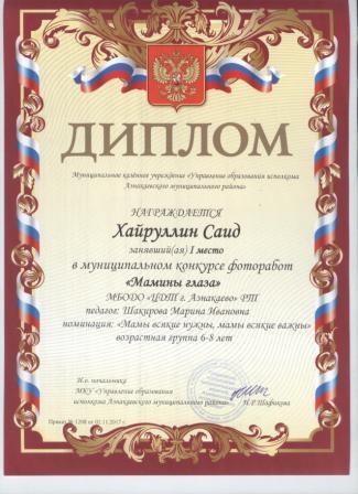 1 место в муниципальном конкурсе фоторабот «Мамины глаза» (Хайруллин С., Шакирова М.И.)