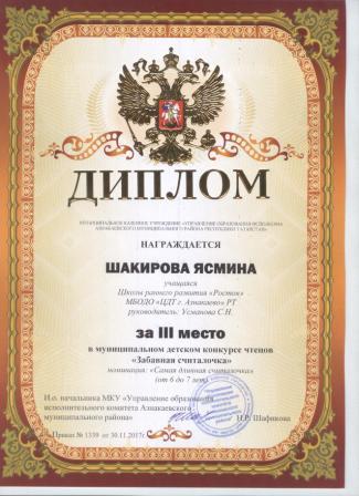 3 место в муниципальном детском конкурсе чтецов «Забавная считалочка» (Шакирова Я., Усманова С.Н.)