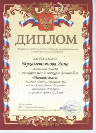 1 место в муниципальном конкурсе фоторабот «Мамины глаза» (Мухаметзянова А, Стрих Р.Р.)