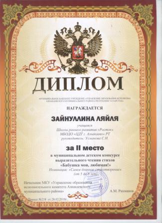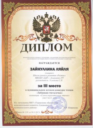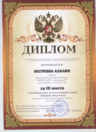 3 место в муниципальном детском конкурсе чтецов «Забавная считалочка» (Зайнуллина Л., Усманова С.Н.)
