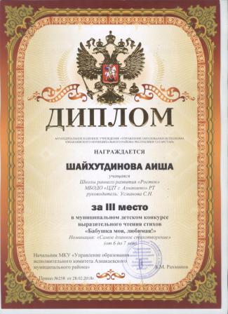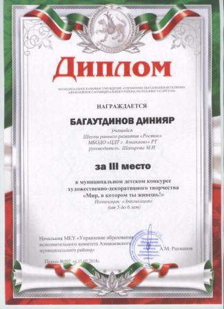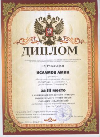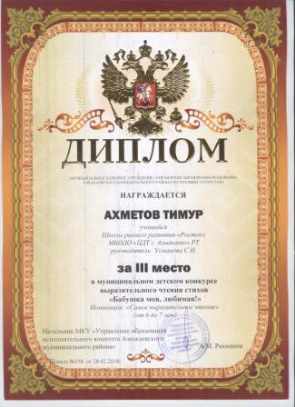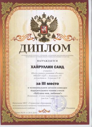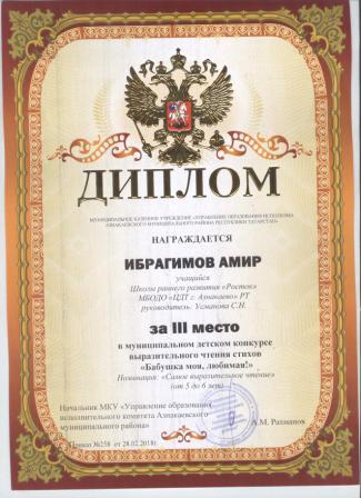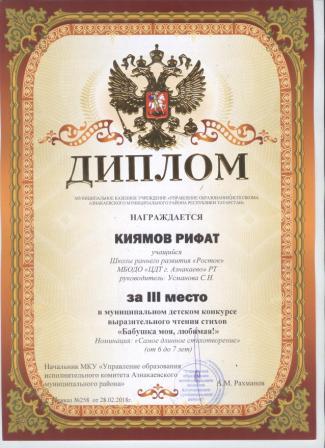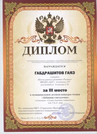 3 место в муниципальном детском конкурсе чтецов «Забавная считалочка» (Аюпов Р., Усманова С.Н.)