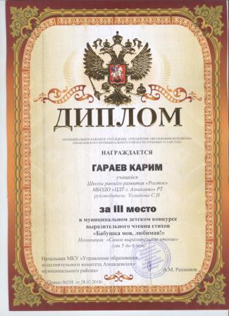 3 место в муниципальном детском конкурсе чтецов «Забавная считалочка» (Гараев К., Усманова С.Н.)