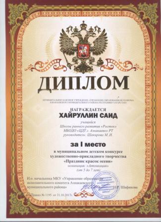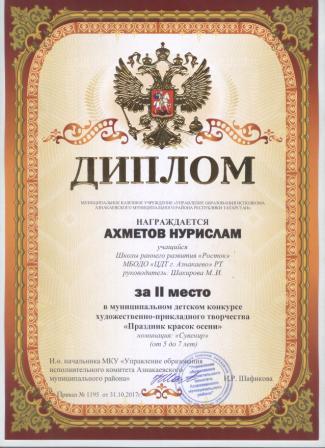 1 место в муниципальном конкурсе "Тукай исән, җыры күңелдә" (Миргалиев А.)