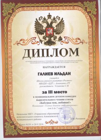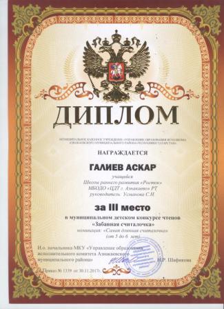 3 место в муниципальном детском конкурсе чтецов «Забавная считалочка» (Галиев А., Усманова С.Н.)