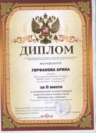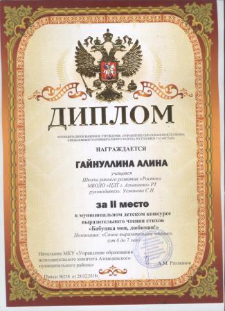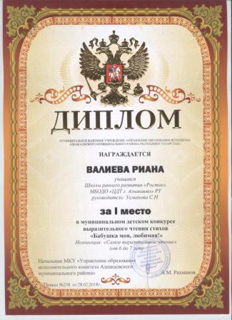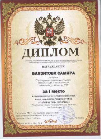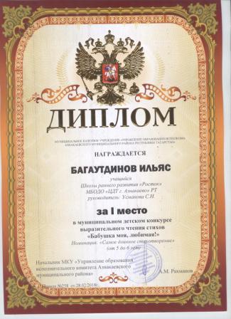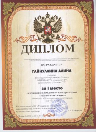 1 место в муниципальном детском конкурсе чтецов «Забавная считалочка» (Гайнуллина А., Усманова С.Н.)