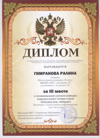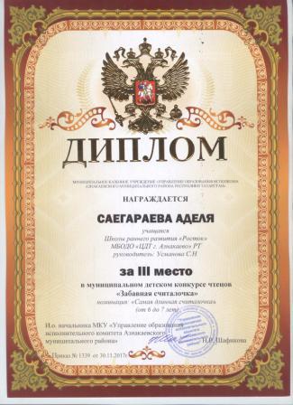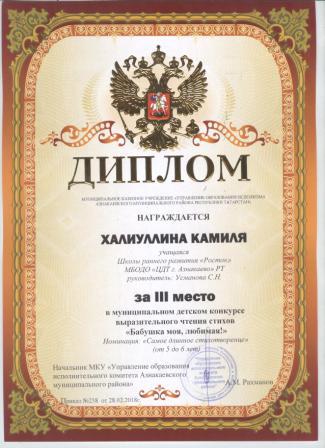 3 место в муниципальном детском конкурсе чтецов «Забавная считалочка» (Сафиуллина Д., Усманова С.Н.)