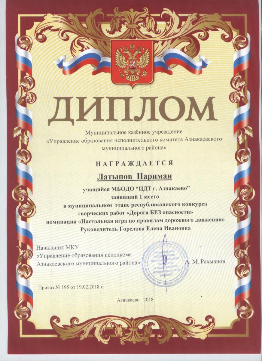 1 место в муниципальных соревнованиях по робототехнике «Роботриатлон – 2» (Каримов Б., Валиев Д.)