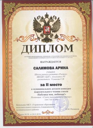 2 место в муниципальном детском конкурсе чтецов «Забавная считалочка» (Салихов К., Усманова С.Н.)