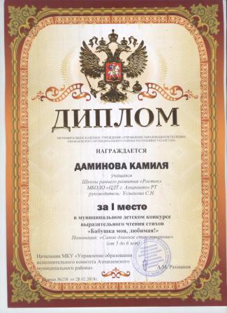 1 место в муниципальном детском конкурсе чтецов «Забавная считалочка» (Даминова К., Усманова С.Н.)