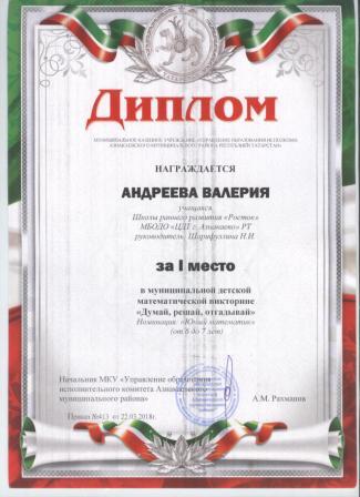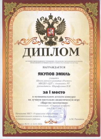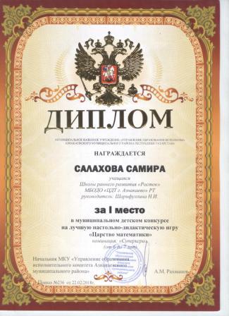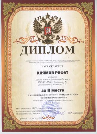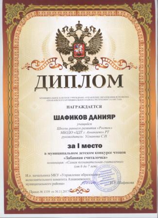 1 место в муниципальном детском конкурсе чтецов «Забавная считалочка» (Шафиков Д., Усманова С.Н.)