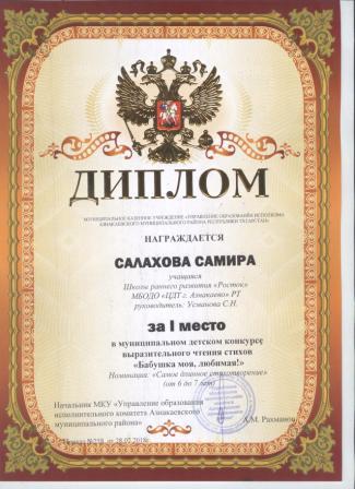 3 место в муниципальном детском конкурсе чтецов «Забавная считалочка» (Салахова С., Усманова С.Н.)