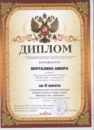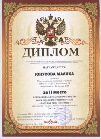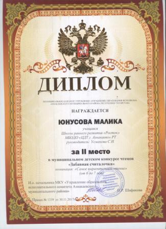 2 место в муниципальном детском конкурсе чтецов «Забавная считалочка» (Юнусова М., Усманова С.Н.)