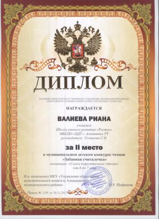 2 место в муниципальном детском конкурсе чтецов «Забавная считалочка» (Валиева Р., Усманова С.Н.)