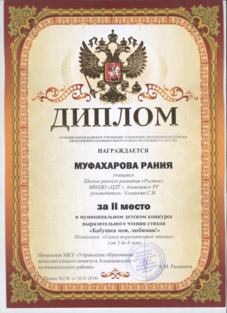 1 место в муниципальном детском конкурсе чтецов «Забавная считалочка» (Муфахарова Р., Усманова С.Н.)