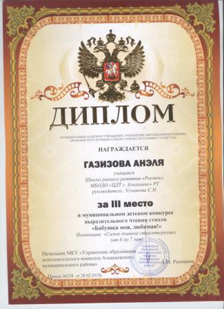 3 место в муниципальном детском конкурсе чтецов «Забавная считалочка» (Гараева Э., Усманова С.Н.)
