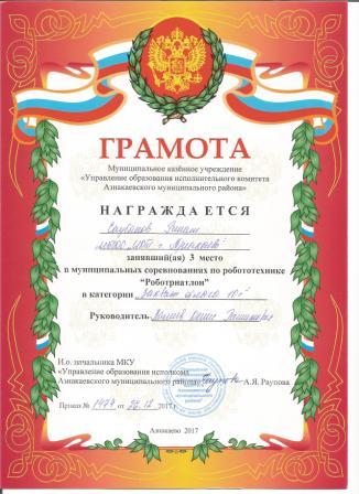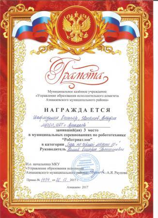 3 место в муниципальных соревнованиях по робототехнике «Роботриатлон» (Шарифуллин Д., Валиев Д.Р.)