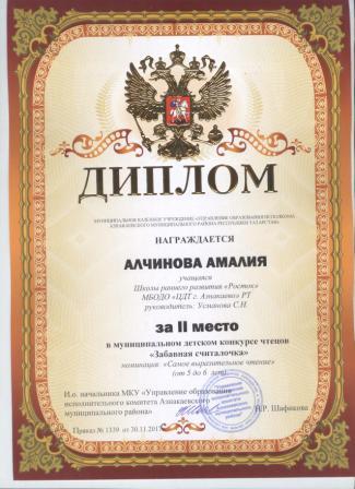 2 место в муниципальном детском конкурсе чтецов «Забавная считалочка» (Алчинова А., Усманова С.Н.)