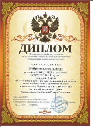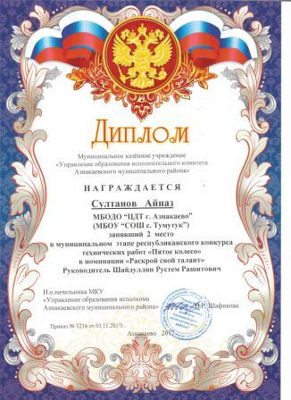 2 место в муниципальном конкурсе технического творчества «Технарь» (Саубанов Р., Валиев Д.Р.)