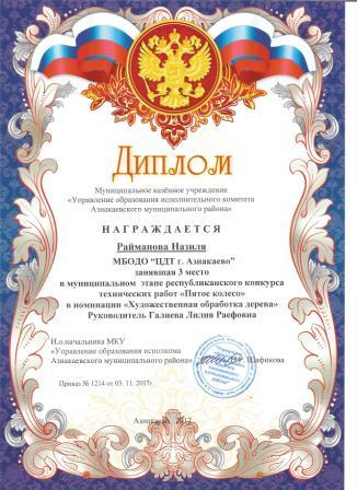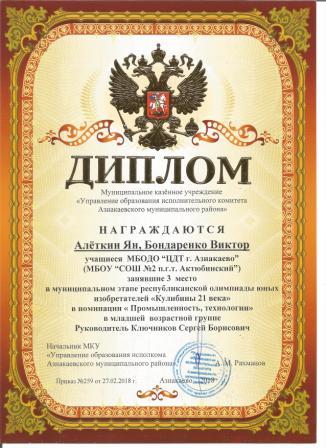 3 место в муниципальном конкурсе технического творчества «Технарь» (Берни Н., Ключников С.Б.)
